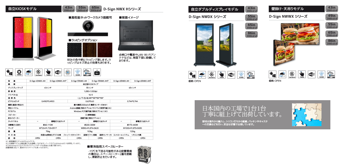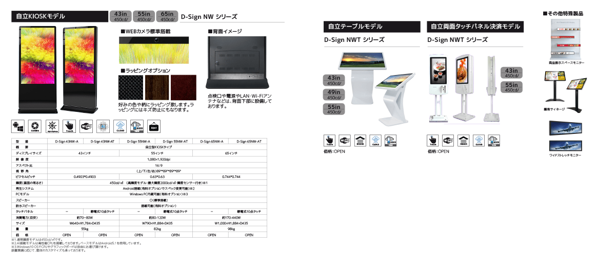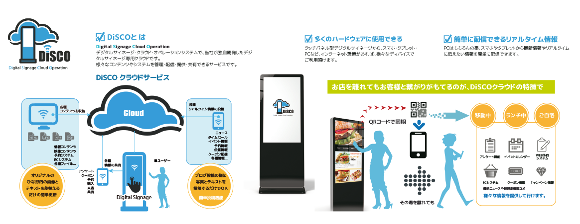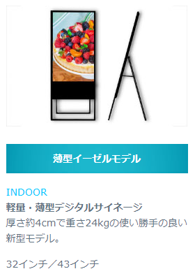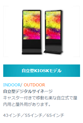 デジタルサイネージ HOME | デジタルサイネージ 豊富なアプリをタブレット端末経由でカンタンに作成や設定が可能。メニューも写真やビデオとの組み合わせ、朝、昼、夜、曜日の指定など、お店の要望に合わせた柔軟な表示指定ができます。 イーゼルタイプから自立型タイプ、屋外用高輝度タイプ、マルチビジョン、インスタグラム再生タイプなど店舗様のご要望に応じたご提案が可能です。 AIをサイネージに導入することによって、今まである一定のルールベースで表示していたコンテンツをお客様の属性に応じて動的に変更したり、データ解析による新たなサービスの創出、音声によるコミュニケーションなど、今までにないサイネージのあり方を創造することができます。 お問合せ