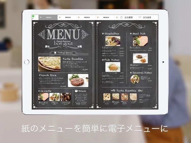 テーブルにiPadを設置するテーブルオーダー「オーダーブック」は、紙メニューそのものがiPadに表示されるので直観的にお客様もオーダーしていただきとても重宝します。(特許申請中)もちろん従業員が注文するオーダーエントリーシステムともシームレスに連携しています。